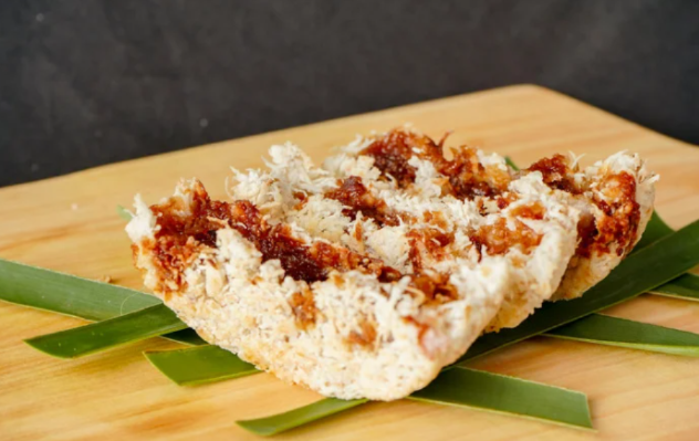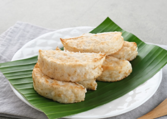 Biasanya kue yang bercita rasa manis gurih ini disajikan di atas daun pisang, kemudian ditaburi parutan kelapa.
