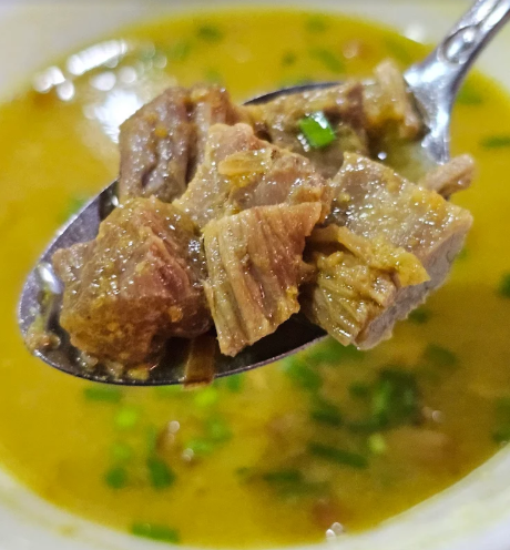 - Punya cita rasa gurih pedas yang khas, dengan kuah kental dan potongan daging melimpah.