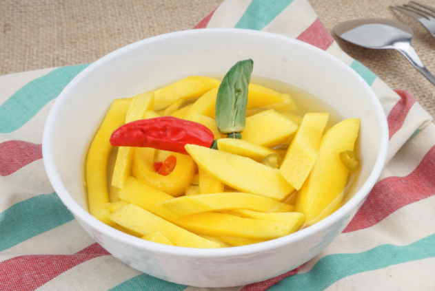 - Siapkan wadah, kemudian masukkan buah mangga muda. Siram dengan kuah gula yang sudah mendidih tadi.