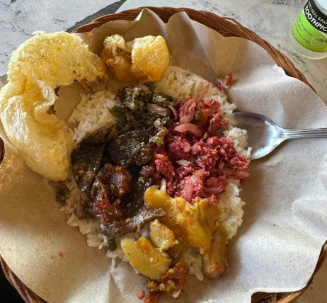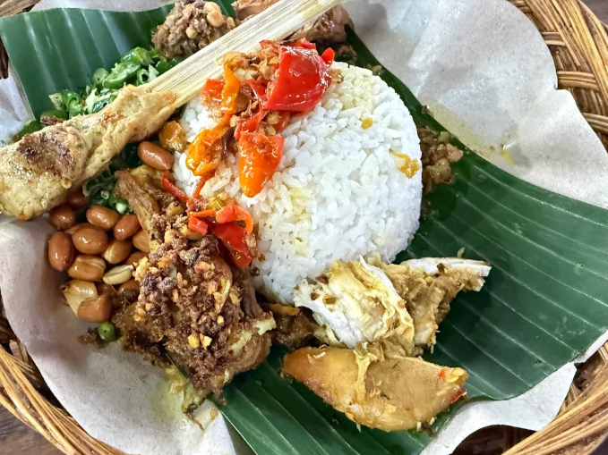 Selain ayam betutu, makanan khas Bali yang juga cukup terkenal adalah nasi jinggo. Kalau dilihat sekilas, mirip dengan nasi kucing karena porsinya yang kecil dan dibungkus dengan daun pisang.