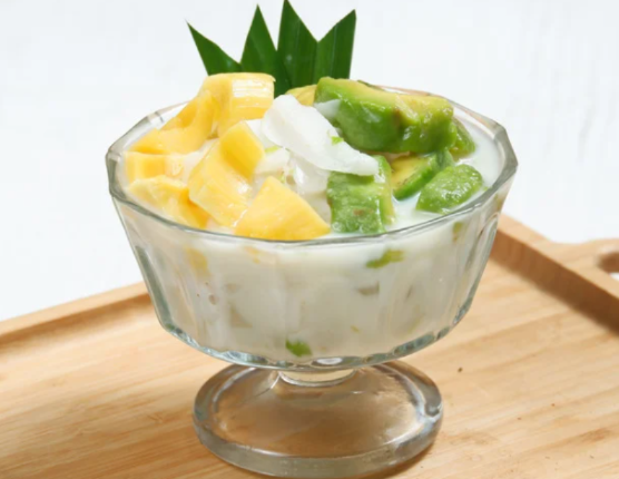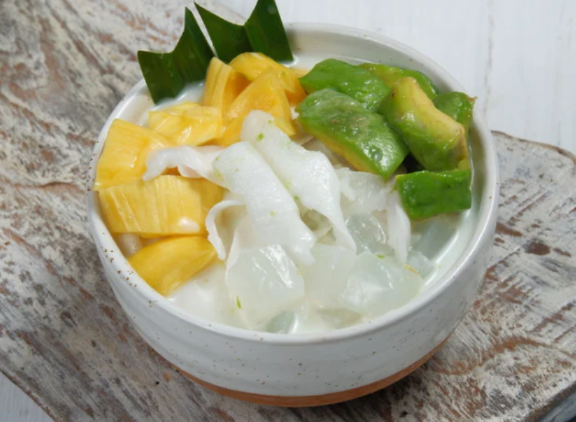 - Setelah itu siapkan mangkuk,lalu masukkan alpukat, nangka, dan kelapa muda. Siram dengan kuah santan dan air gula yang sudah direbus tadi.